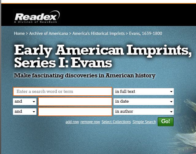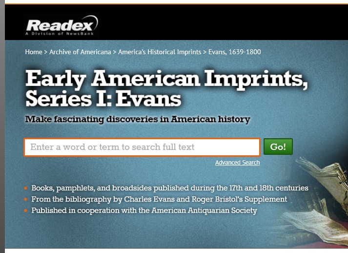The Early American Imprints database is one of the key online collections for research in early American printed materials. It grew from two sources. First was the bibliography compiled by Charles Evans, titled American Bibliography, first published between 1903 and 1934. Evans tracked the publication of every known imprint in America from 1639 to 1800. American Bibliography eventually encompassed fourteen volumes covering over 30,000 imprints from the time period. Evans assigned each a unique identifying number, which system was continued in Early American Imprints.